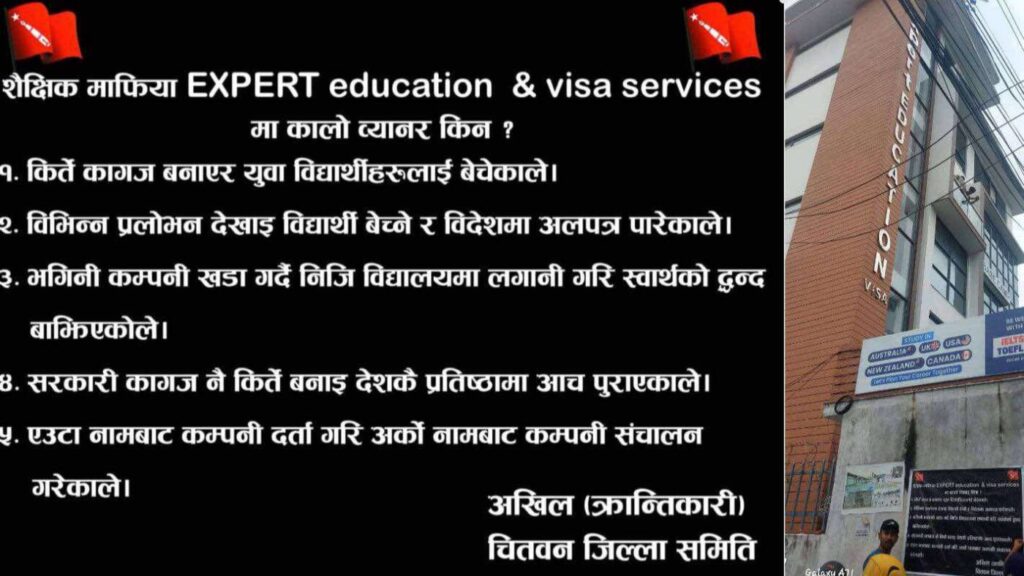नेपाल कम्युनिष्ट पार्टी बहुमत निकट बिद्यार्थी संगठन अखिल क्रान्तिकारीले एक्सपर्ट एजुकेशन एण्ड भिसा सर्भिसेसको कार्यालयमा कालो ब्यानर झुण्ड्याएको छ । चितवनको भरतपुर १० मा अवस्थित कार्यालयमा क्रान्तिकारीका बिद्यार्थीहरुले मंगलबार कालो ब्यानर झुण्ड्याएका हुन ।